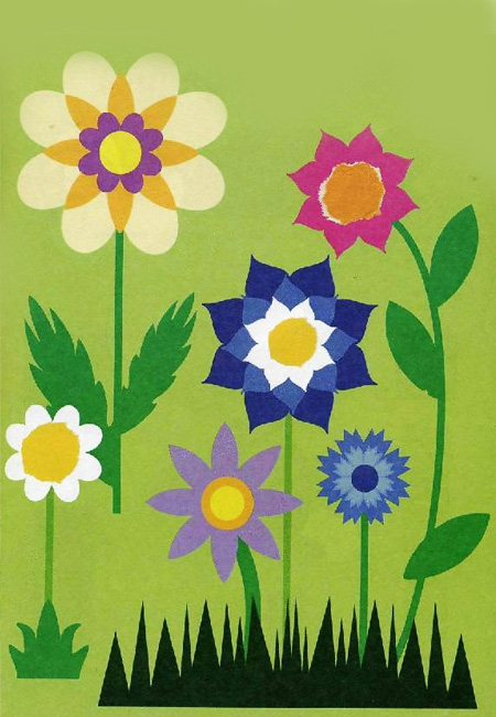 Складаємо квадратний аркуш по діагоналі, потім ще, потім ще і малюємо пелюстка, розгортаємо - отримуємо цілий квітка. Малюнок пелюстки може бути яким завгодно, округленим, гострим, з зубчиками (волошка).