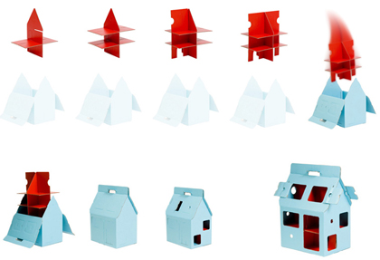 Сама ідея дуже цікава. Будинок складається з двох збірних частин: внутрішніх стінок і підлоги і зовнішніх стін. Одна конструкція повинна вставлятися в іншу через открываемую дах.