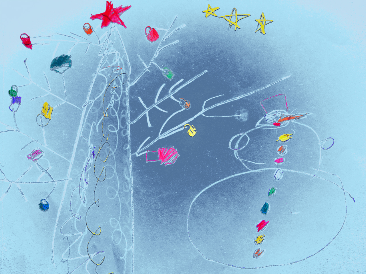 Дитяча картинка перероблена в шпалери для робочого столу. Зимовий дитячий малюнок зі сніговиком і прикрашеним деревом.