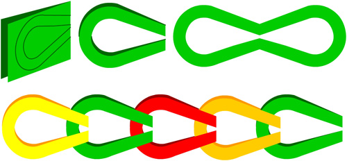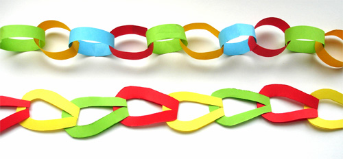 Сам принцип показано на малюнку внизу. З складених навпіл смужок різнокольорового паперу нарізаємо ланки. Ланки попередньо на смужках малюємо простим олівцем або вирізаємо з картону шаблон і кожен раз його обводимо, що теж корисно для розвитку дрібної моторики.