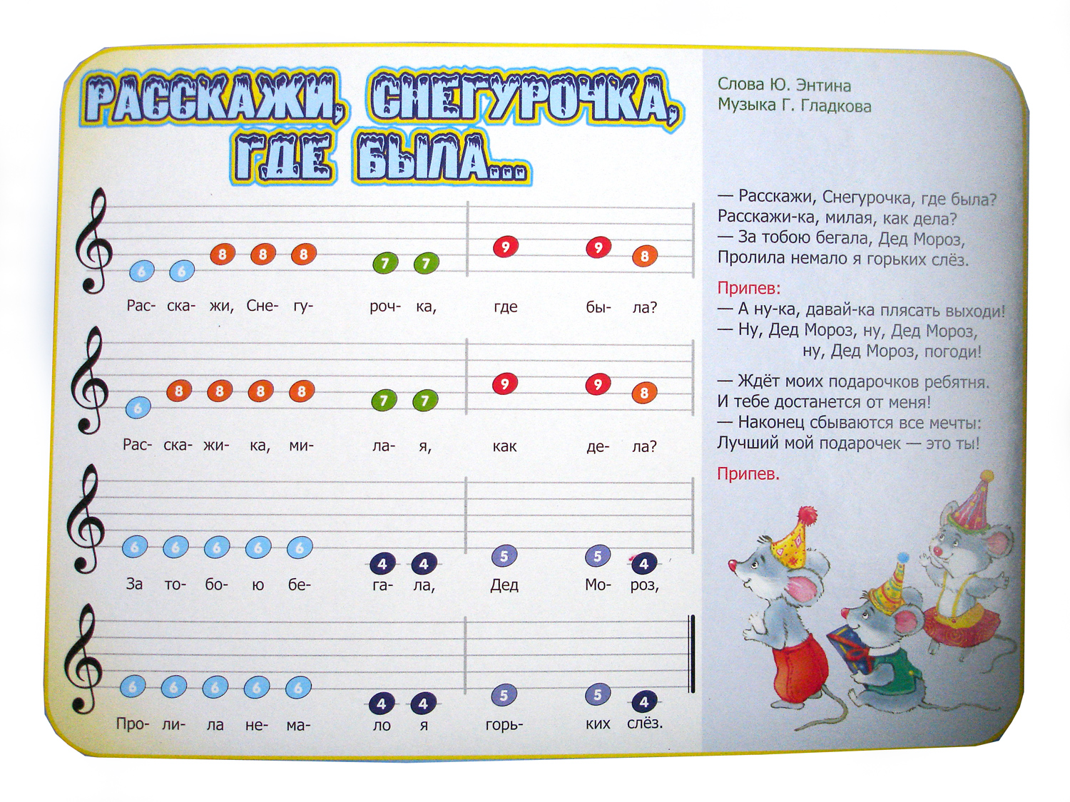 Кольорові ноти з книги "Зимові пісеньки". Розкладку кольорів на клавішах можна подивитися на сторінці з книгою. |
