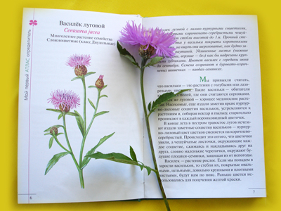 На останній фотографії видно схожість оригінального квітки волошки з його мальованим зображенням. Всі картинки чіткі розміром на всю сторінку. Наукової інформації не багато, що в принципі для дітей дуже добре. Зате до кожного рослині є невеликий оповіданнячко про походження назви рослини і корисності його для природи і людей.