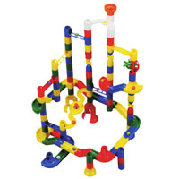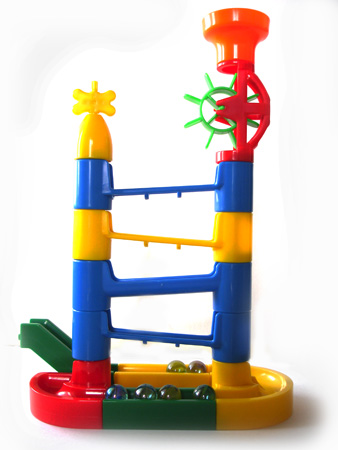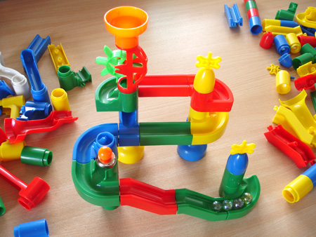 В комплект конструктора входять деталі, де кулька котиться всередині, містки - де кульки котяться зовні. Їх можна весь час по різному сполучати домагаючись ефекту, що кулька то пірнає в трубу, то викочується на місток або балкончик. Цікава деталь з млином, дзвіночком, перехідником, який своїм механізмом направляє кульки то в один то в інший напрямок по черзі. Не дивлячись, що виробник Китай, всі деталі гладенькі, легко з'єднуються один з одним (закриваються) і роз'єднуються також просто. Їх приємно просто тримати в руках.