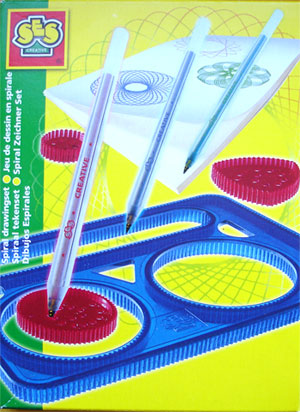 З Вікіпедії: Спірограф - дитяча іграшка, що складається з пластмасової пластини з вирізаними колами різних діаметрів і набору коліс меншого діаметру з отворами. Краї кіл і коліс зубчасті, щоб запобігти прослизання. Метод використання: пластина прикладається до аркуша паперу, всередину обраного кругового отвору міститься одне з зубчастих коліс, в один з отворів якого вставляється кулькова ручка або олівець. Потім зубчасте колесо, що приводиться в рух легким натиском на пишучий елемент, який залишає на папері красивий спіральний слід.