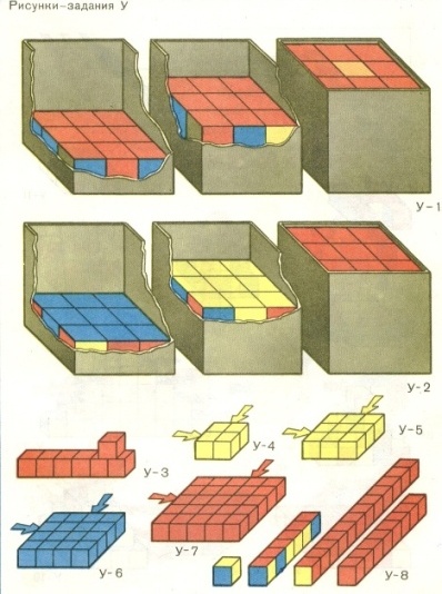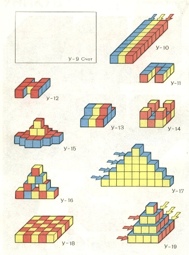 - У-46. Склади триповерховий червоний будинок на 9 квартир, але так, щоб задня стінка була синьою. Це може бути підготовка до роз'ємним завдань, де працює "внутрішній порядок".