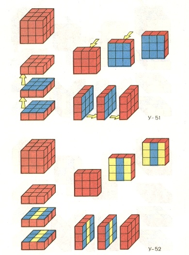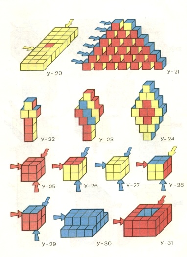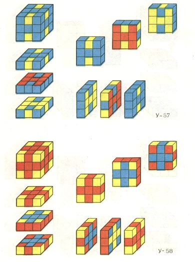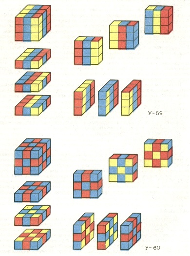 - У-59. Хто складе великий куб так, щоб всі зовнішні і всі внутрішні грані роз'єму (18 граней) були смугасті триколірні? (Куб Толі Заверняева, 19 років).
