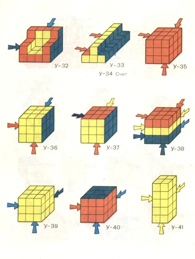 Потім усередині кожного ряду розкласти їх по сортам, але вже синього (або якщо треба - жовтого) кольору. Ближче до себе покласти кубики з трьома синіми гранями, далі - з двома і ще далі - з однією. Виходять "тріади", як на У-43. Подвійна класифікація помітно полегшує виконання найскладніших завдань N 44 - 50, так як відразу можна знайти кубик з заданим числом і кольором граней. Наприклад, всі "троячки червоні" лежать в ряді К-3, "троячки сині" - це найближчі до дитини кубики (їх просто не видно), а "троячки жовті" - найдальші в кожному ряду.