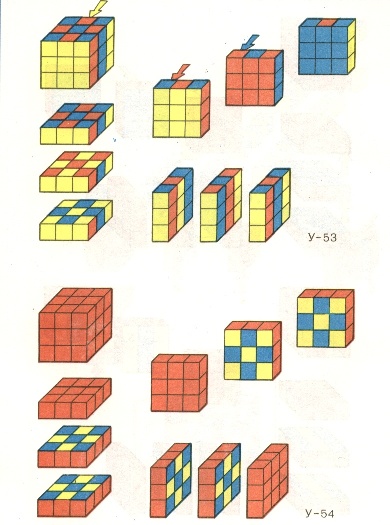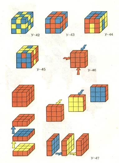 - У-60. Хто складе великий куб найвищої складності? Всі 6 зовнішніх граней і 12 внутрішніх мають шахову забарвлення. Якщо зовні 6 червоно-синіх, то 6 внутрішніх червоно-жовті і ще 6 синьо-жовті (Куб Антона Нікітіна, 19 років).