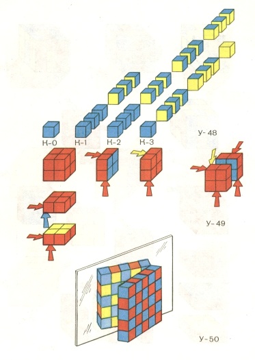 - У-50. Двостороння шахова дошка, розміром 5Х5 (У-46). Всі 6 граней мають шахову забарвлення. Велика, невидима на малюнку грань повинна бути червоно-жовтого або жовто-синій, а вузькі грані - тієї ж забарвлення, що і одна з широких. На рис. 46 усі вони червоно-сині. Це одне з найскладніших завдань. При його виконанні майже все роблять помилки і втрачають масу часу на їх виправлення, перестановку кубиків (дошка Сергія Бєляєва, 14 років).