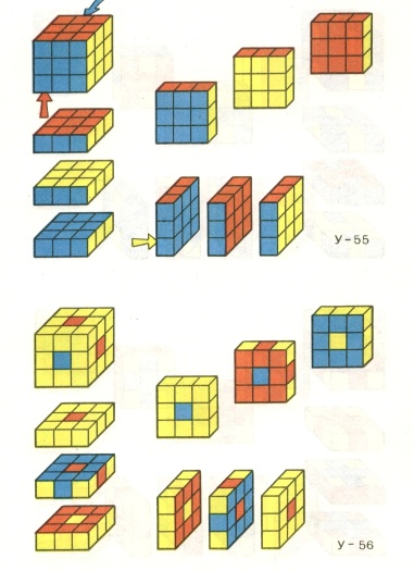 - У-55. Хто складе великий куб, щоб всі зовнішні межі попарно протилежні були одноцветны;- всі внутрішні грані роз'єму, дотичні, попарно одноколірні? (Куб Толі Заверняева, 19 років).