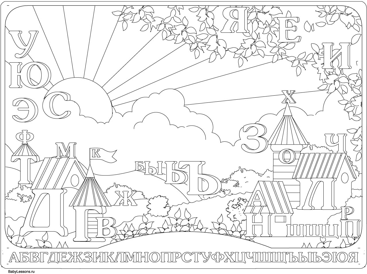 На картинке для раскрашивания спрятаны буквы из алфавита.