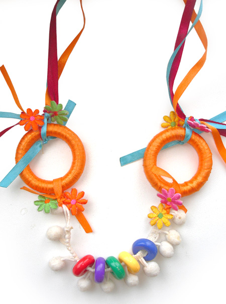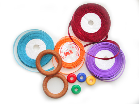 Різнокольорові стрічки, кільця для штор, тасьма з квіточками, тасьма з дзвіночками (тут відрізали ручки від подарунковій паперової сумки), намистини від брязкальця.