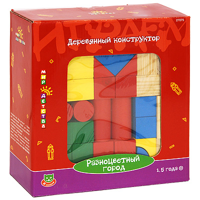 | Деревянный конструктор из разноцветных кубиков. “Разноцветный город” Возраст: от 1,5 года. Размер коробки: 22,5 см х 23,5 см х 9 см. Производитель: Россия, “Мир детства”