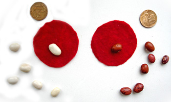 Квасоля (бажано двох кольорів), картонна коробка з-під цукерок, дві монети по 50 копійок, фломастери та кольоровий папір, невеликий шматочок фетру або іншого щільного матеріалу.