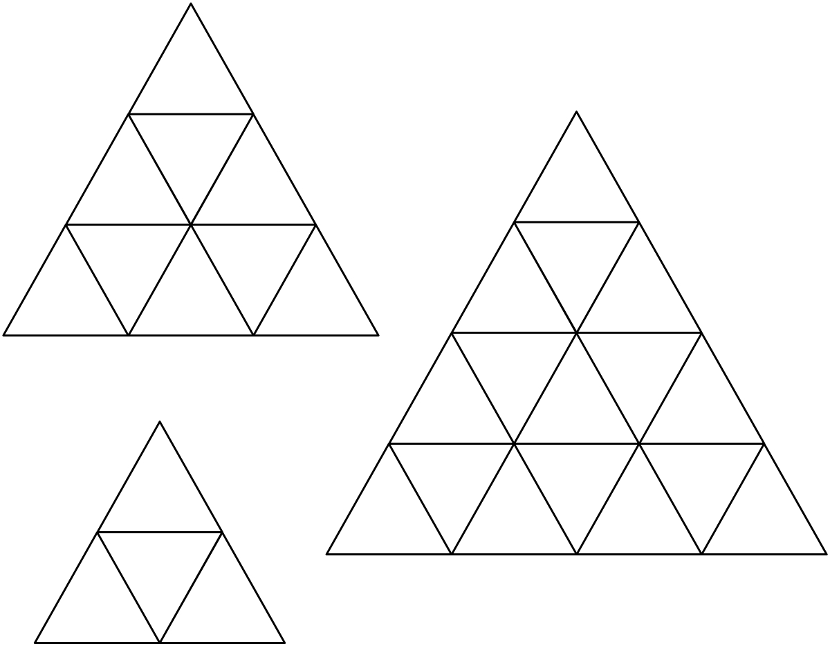 Распечатай картинку и вырежи из бумаги такие фигуры. Разрежь фигуры на треугольнике и посчитай, сколько всего треугольников (одиночных и составных) помещается в каждой фигуре.