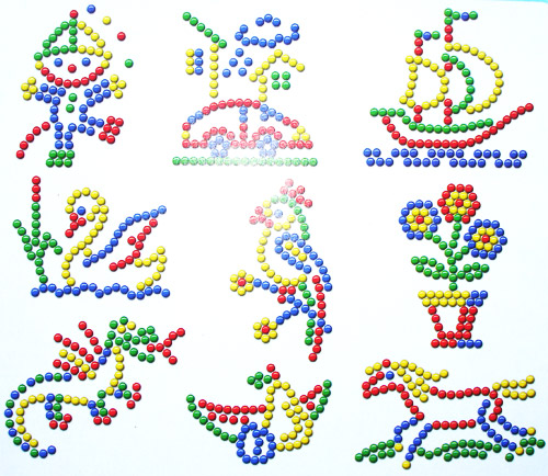 Здавалося б, що можна зібрати з таких різнокольорових кружечків. На звороті коробки є приклади малюнків, намальованих мозаїкою, щоб на холодильнику, крім квіточок і будиночків, у вас з'являлися і справжні шедеври.