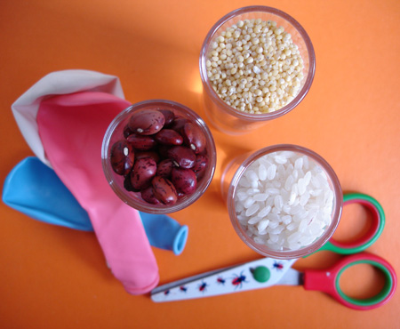 Для початку, визначимось з наповнювачем. Пропонуємо на вибір: гречану крупу, пшоно або рисову, квасоля або горох. Рисова крупа дуже приємно скрипить у м'ячі (як ніби ліпимо сніжок) і м'яч з рисом легко піддається метаморфоз і тримає форму. М'ячик з квасолею приємний на дотик - весь бугристий і хрумтить при натисканні. М'ячики з пшоняною крупою і гречкою на дотик шарудять.