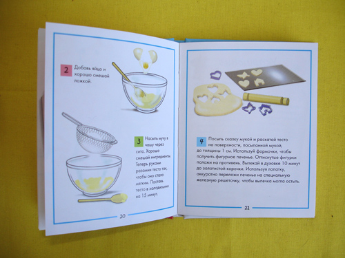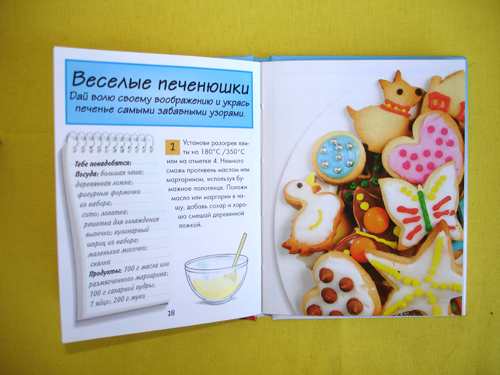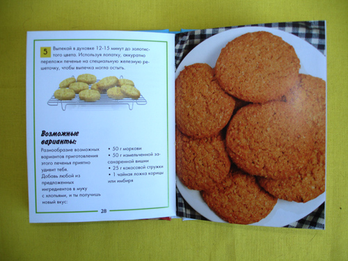 Книжка, несмотря на маленький размер включает в себя подробные рецепты с большими фотографиями готовой выпечки и пошаговыми рисунками самого процесса. Из рецептов: сырное печенье, сырные джеки, сырные палочки, веселые печенюшки, рецепт украшений, хрустяшки, шоколадное печенье, рождественское печенье, имбирный человечек, овсяное печенье. Фото яркие, аппетитные, ребенок с восторгом каждый раз выбирает рецепт для очередного кулинарного шедевра. Рецепты достаточно просты и мы выложили несколько на нашем сайте в рубрике “Простые рецепты“. Единственно что, для двух рецептов нет подходящих формочек - это рождественские печенья и имбирные человечки. Так что, если вам нужны новогодние формочки ангелочков, звездочек, колокольчиков, елочек и имбирных человечков (как на фото коробки) - покупайте отдельно. Хотя сам рецепт подойдет не только к празднику.