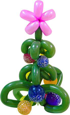 4 зеленых шарика-колбаски, 1 красный шарик-колбаска для звезды и маленькие круглые шарики для елочных украшений.