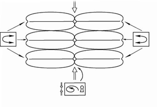Возьмите красный шарик-колбаску (на фото - розовый) сверните в кольцо и завяжите узелком. Далее полученное кольцо перекручиваем по верхней схеме. У Вас должно получиться три одинаковых колечка. - 8. Сожмите полученный элемент гармошкой (верхний рисунок), складывая колечки пополам и перекрути так, чтобы получилось шесть лепестков.