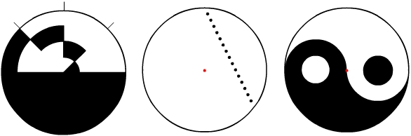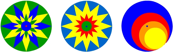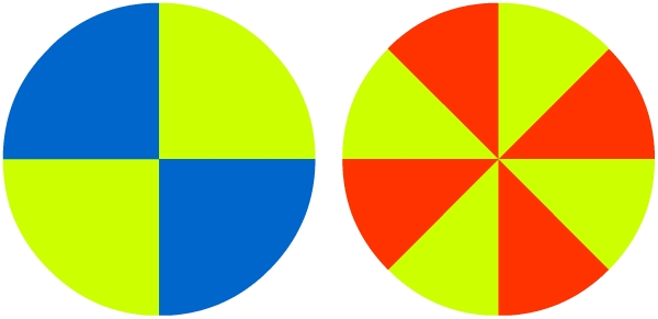 Найпростіші схеми волчков - це по секторах. Коло ділиться на парне число секторів і розфарбовуються, наприклад, жовтий і синій кольори або в жовтий і червоний. При обертанні ми побачимо відповідно зелений і оранжевий.