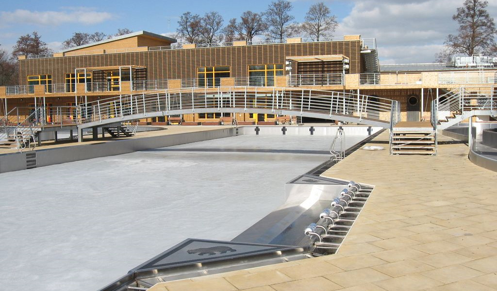 Тут немає яскравих і недоладних гірок і синьої плівки на дні басейнів. Серед матеріалів, що використовуються для будівництва гірок, мостиків і басейнів - тільки сріблястий метал (гірки і конструкції), натуральне дерево(містки переходи) і керамічний граніт для облицювання майданчиків. Сама будівля з роздягальнями та саунами - двоповерхова з фасадом закритим ґратчастими дерев'яними панелями. виглядає дуже стильно і красиво, хоча і несподівано.