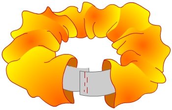 - Візьміть смужку тканини приблизно 10 см. товщиною і довжиною в 1,5-2 рази довша гумки, довжина залежить від товщини тканини. Чим тонша тканина, чим більше на ній можна зробити складок, тим довше беріть смужку.