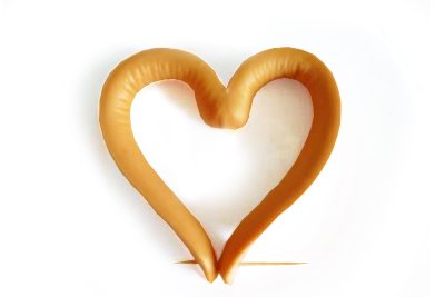 - Выверните сосиску наружу и скрепите зубочисткой острый угол у получившегося сердца, как на фотографии.